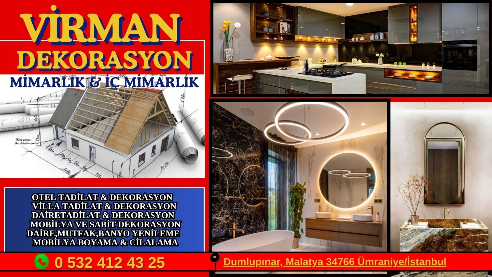 Ümraniye dekorasyon firmaları arasında en çok tercih edilen Virman Mimarlık ve İç mimarlık dekorasyon firması ev ve iş yerlerinde ihtiyaç duyulan tadilat, tamir, montaj çalışmalarını profesyonelce sağlar. Bölgedeki dekorasyon firması; boya badana, zemin yenileme, mutfak ve banyo tadilatı, duvar kaplama, alçıpan uygulamaları ve mobilya montajı gibi geniş bir hizmet yelpazesi sunar. Ümraniye’de dekorasyon hizmeti almak isteyenler, hem estetik hem de fonksiyonel çözümler üreten firmalar sayesinde yaşam alanlarını modern ve kullanışlı bir hale getirebilir.
